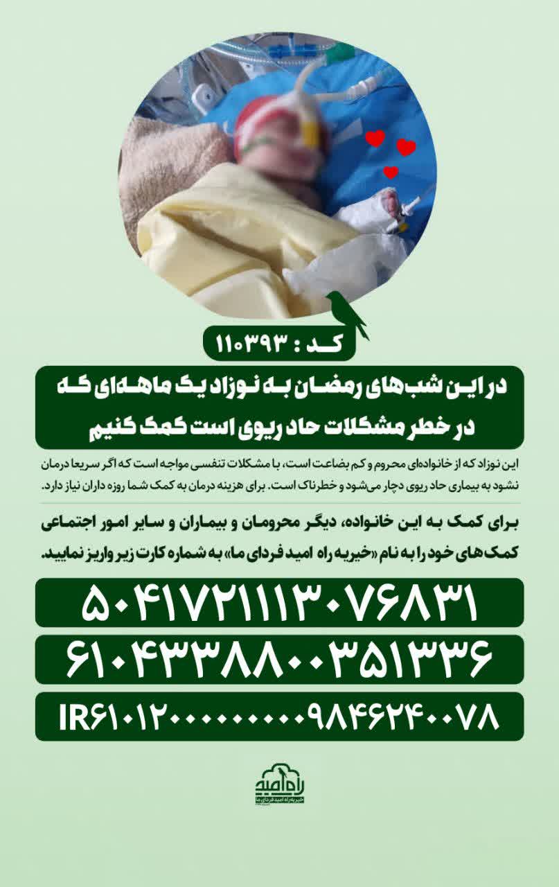 این نوزاد که از خانوادهای محروم و کم بضاعت است، با مشکلات تنفسی مواجه است که اگر سریعا درمان نشود به بیماری حاد ریوی دچار میشود و خطرناک است. برای هزینه درمان به کمک شما روزه داران نیاز دارد.