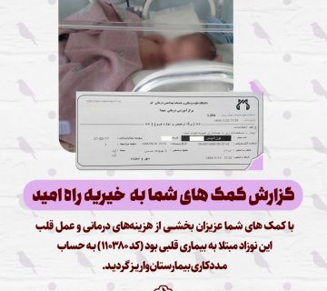 با کمک های شما خیرین بخشــی از هزینههای درمانی جوان سرایداری که همراه همسرش مبتلا به سوختگی شده بوده بـه حساب مـددکاری بیمارستان واریـز گردیـد.
