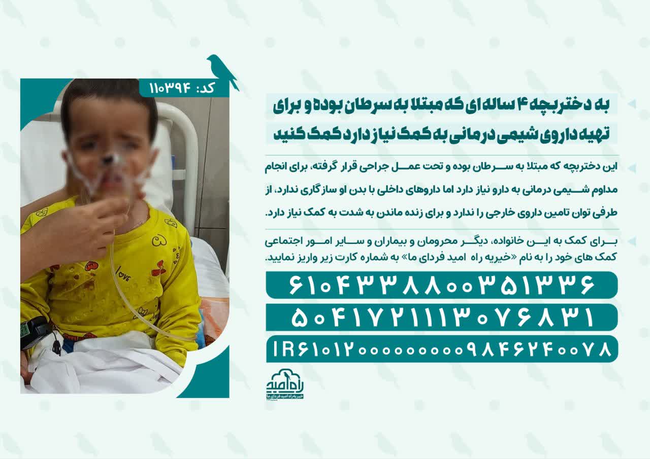 این دختربچه که مبتلا به سرطان بوده و تحت عمل جراحی قرار گرفته، برای انجام مداوم شیمی درمانی به دارو نیاز دارد اما داروهای داخلی با بدن او سازگاری ندارد، از طرفی توان تامین داروی خارجی را ندارد و برای زنده ماندن به شدت به کمک نیاز دارد.