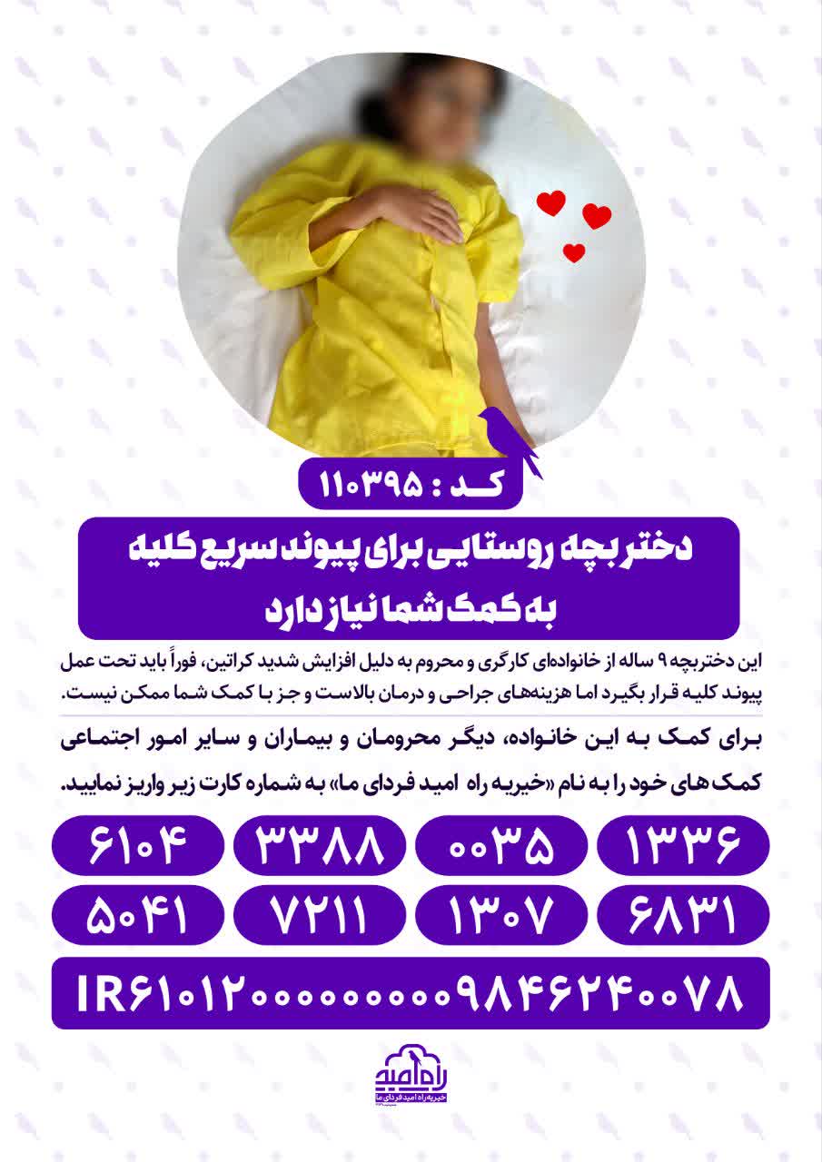 این دختربچه ۹ ساله از خانواده‌ای کارگری و محروم به دلیل افزایش شدید کراتین، فوراً باید تحت عمل پیوند کلیه قرار بگیرد اما هزینه‌های جراحی و درمان بالاست و جز با کمک شما ممکن نیست.