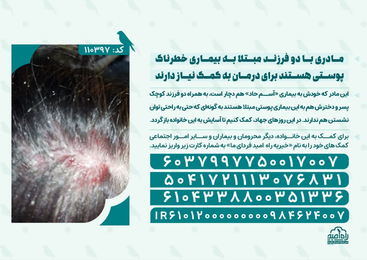 این مادر که خودش به بیماری «آسم حاد» هم دچار است، به همراه دو فرزند کوچک پسر و دخترش هم به این بیماری پوستی مبتلا هستند به گونهای که حتی به راحتی توان نشستن هم ندارند. در این روزهای جهاد، کمک کنیم تا آسایش به این خانواده بازگردد.