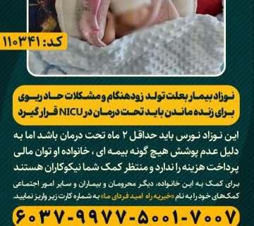 نوزاد بیمار بعلت تولد زودهنگام و مشکلات حاد ریوی، برای زنده ماندن باید تحت درمان در NICU قرار گیردAdminسپتامبر 18, 2025ایـن نــوزاد نــورس باید حداقـل ۲ ماه تحت درمان باشـد اما بـه دلیل عـدم پوشش هیـچ گونـه بیمــه ای ، ... ادامه مطلب