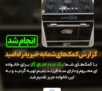گزارش کمکهای شما به خیریه راه امید:Adminژوئن 30, 2025کمکهای شما یک عدد اجاق گاز برای خانوادهای محروم و دارای سه فرزند یتیم تهیه گردید و به این خانواده ... ادامه مطلب