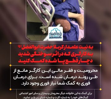 به نیت علمدار کربلا حضرت ابوالفضل(ع) به کارگری که در اثر سوختگی شدید دچار قطع پا شده کمک کنیدAdminژوئن 30, 2025محرومیت و فقر مالی این کارگر مانع از طی روند درمان شده است. برای درمان فوری به کمک شما نیاز ... ادامه مطلب