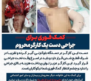 کمک فوری برای جراحی دست یک کارگر محرومAdminمی 30, 2025دست این کارگر در دستگاه بلوکزنی گیر کرده و تقریبا در شرف قطع شدن قرار دارد و باید در اسرع ... ادامه مطلب