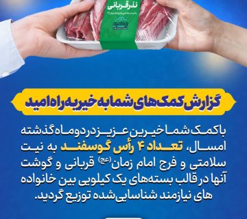 گزارش کمکهای شما به خیریه راه امید:Adminمی 30, 2025با کمک شما خیرین عزیز در دوماه گذشته امسال، تعداد ۴ رأس گوسفند به نیت سلامتی و فرج امام زمان ... ادامه مطلب