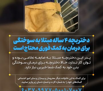 دختربچه ۴ ساله مبتلا به سوختگی برای درمان به کمک فوری محتاج است Adminژوئن 1, 2025پدر این دختربچه مبتلا به ضایعه نخاعی بوده و توان کار ندارد، حالا دختربچه برای درمان سوختگی بدن خود به ... ادامه مطلب