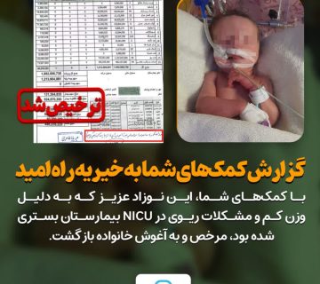 گزارش کمکهای شما به خیریه راه امید(کد 110275):Adminژوئن 1, 2025 با کمکهای شما، این نوزاد عزیز که به دلیل وزن کم و مشکلات ریوی در Nicu بیمارستان بستری شده ... ادامه مطلب
