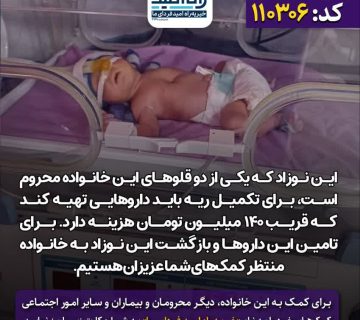 کمک به نوزادی که ریهاش کامل تشکیل نشدهAdminمی 19, 2025این نوزاد که یکی از دو قلوهای این خانواده محروم است، برای تکمیل ریه باید داروهایی تهیه کند که قریب ... ادامه مطلب