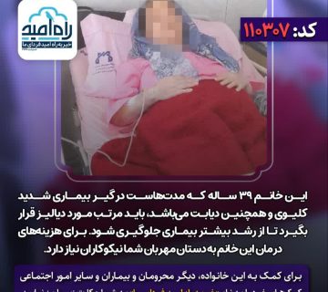 به خانم جوانی که به دلیل مشکلات شدید کلیوی در بیمارستان بستری است کمک کنیدAdminمی 30, 2025این خانم ۳۹ ساله که مدتهاست درگیر بیماری شدید کلیوی و همچنین دیابت میباشد، باید مرتب مورد دیالیز قرار بگیرد ... ادامه مطلب