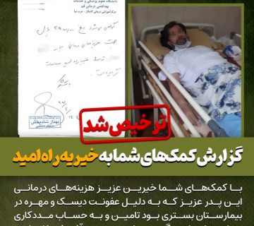 گزارش کمکهای شما به خیریه راه امید (کد 110285):Adminمی 30, 2025با کمکهای شما خیرین عزیز هزینههای درمانی این پدر عزیز که به دلیل عفونت دیسک و مهره در بیمارستان بستری ... ادامه مطلب