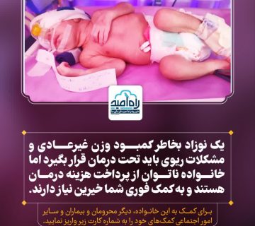 یک نوزاد بخاطر کمبود وزن غیرعادی و مشکلات ریوی باید تحت درمان قرار بگیرد اما خانواده ناتوان از پرداخت هزینه درمان هستند و به کمک فوری شما خیرین نیاز دارند.
