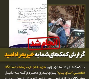 گزارش کمکهای شما به خیریه راه امیدAdminمارس 5, 2025با کمکهای شما عزیزان،هزینه اجاره دوماهه دستگاه تنفسی “بای پپ” برای پدری محروم که به دلیل مشکلات حاد تنفسی و ... ادامه مطلب