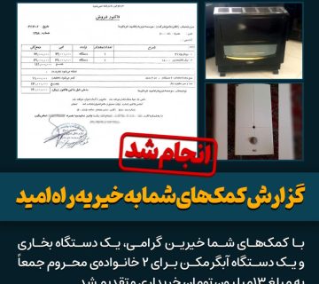 گزارش کمکهای شما به خیریه راه امید:Adminمارس 9, 2025با کمکهای شما خیرین گرامی، یک دستگاه بخاری و یک دستگاه آبگرمکن برای 2 خانوادهی محروم جمعاً به مبلغ 13میلیون ... ادامه مطلب